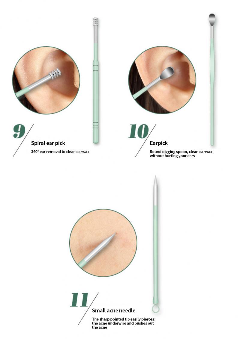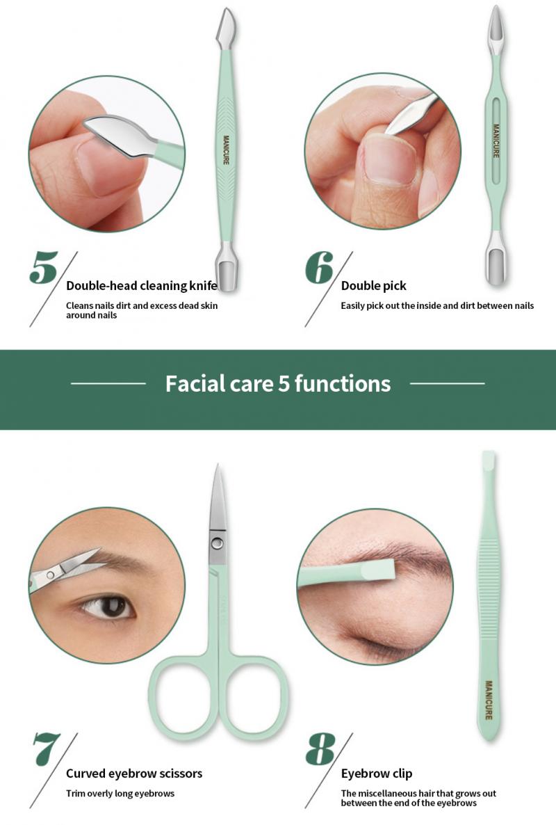 Multiusos: este conjunto de herramientas de manicura incluye cortaúñas, tijeras para cejas, pinzas, cuchara para orejas, aguja para el acné y lima de uñas, entre otros. Se puede utilizar para uñas en manos y pies, orejas o cejas. Eliminar la piel vieja, recortar y pulir las uñas.